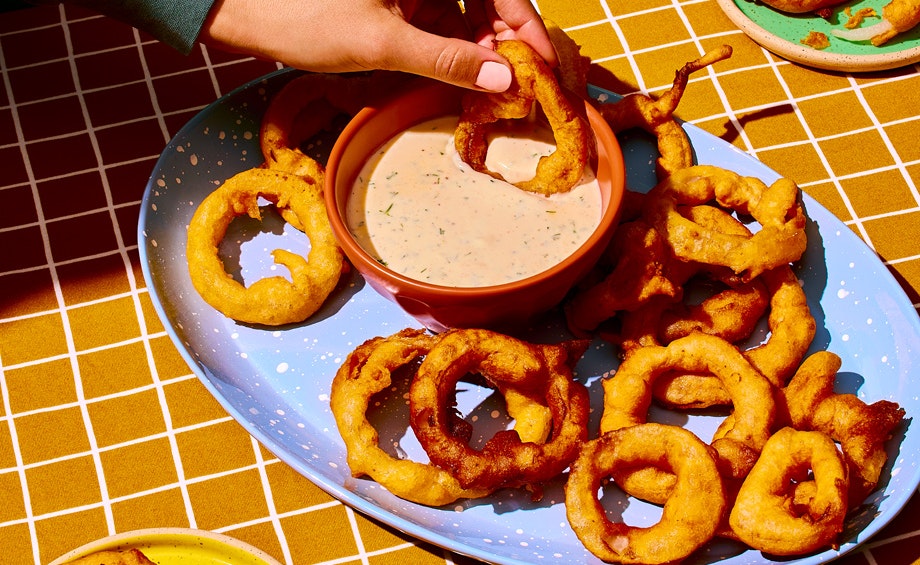 Rondelles d’oignon à la bière et sauce crémeuse aux fromages