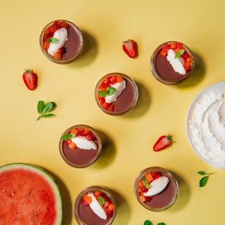 Panna cotta au lait au chocolat, fraise et melon d’eau