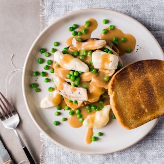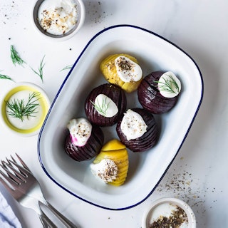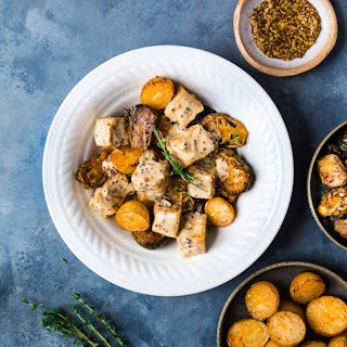 Bol de tofu à la moutarde, pommes de terre et choux de Bruxelles rôtis