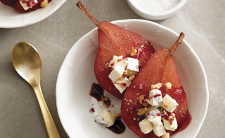 Poires pochées au porto, fromage et noix