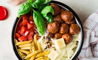Soupe repas en pot aux pâtes vermicelles, poulet, carottes et épinards