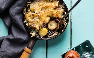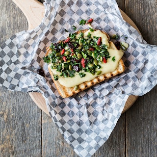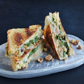 Grilled cheese aux noisettes caramélisées, poires et roquette