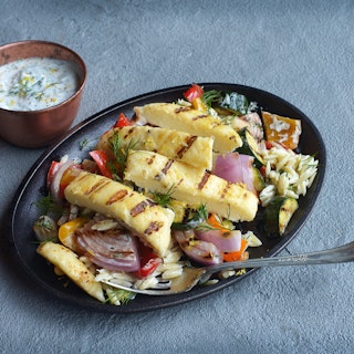 Salade d'orzo, légumes et fromage grillé avec vinaigrette crémeuse à l’aneth