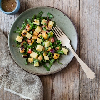 Salade de pêches grillées et fromage, vinaigrette au miel et livèche