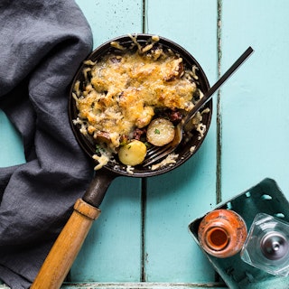 Poêlée de grelots, pistaches et lardons, gratinée