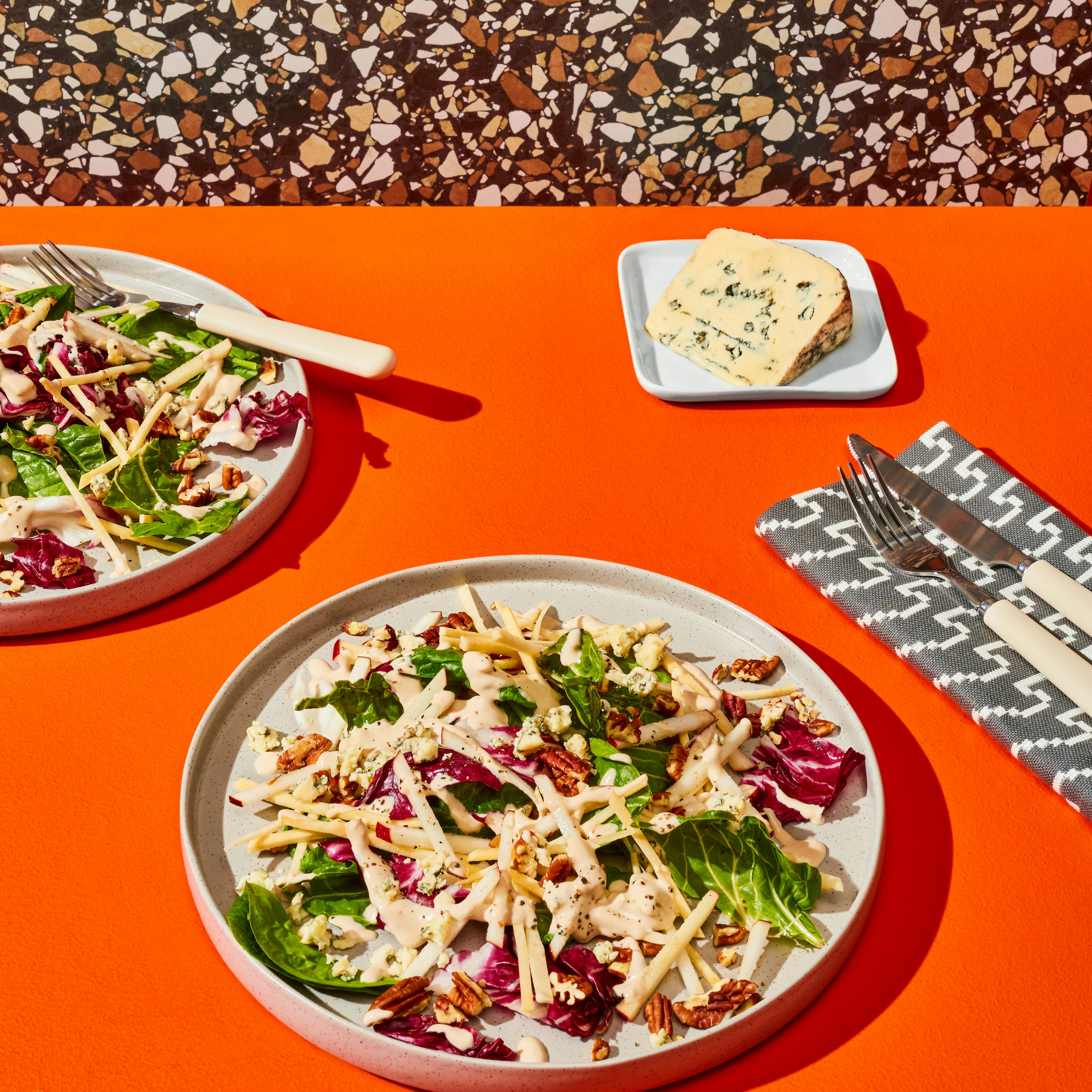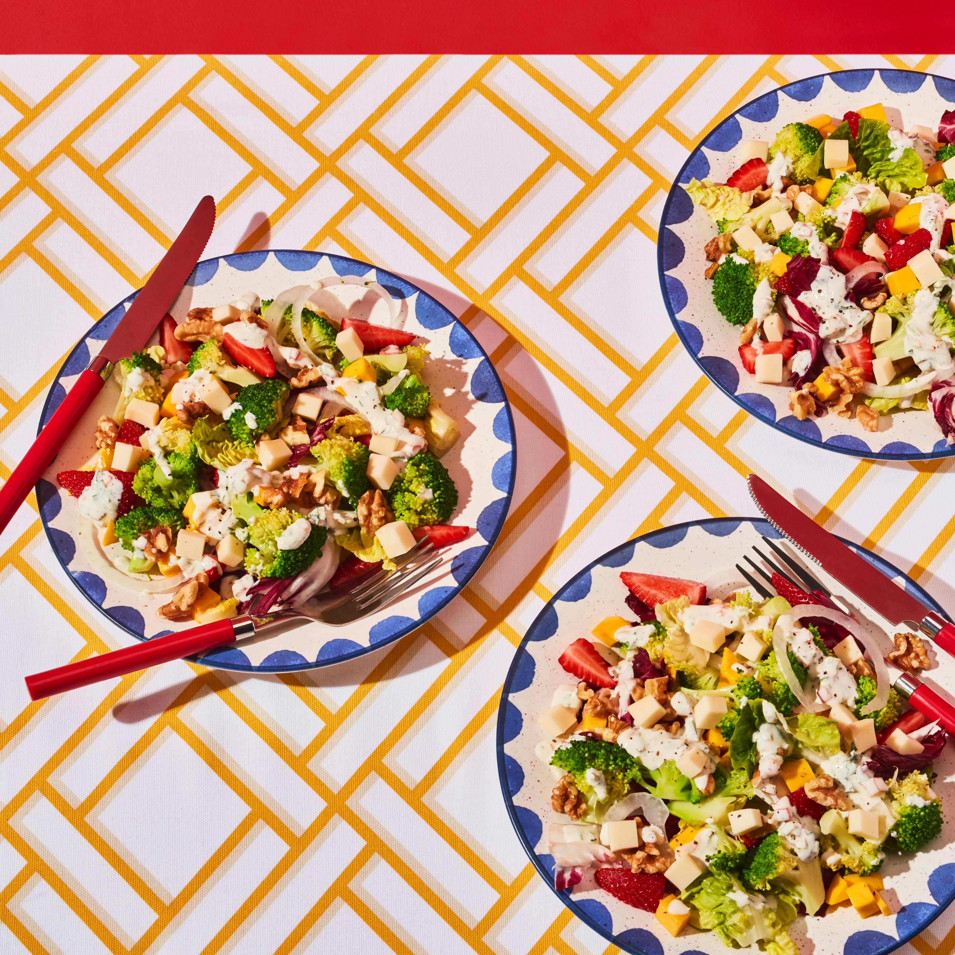 Salade aux fraises, à la mangue et au brocoli, vinaigrette crémeuse à la coriandre