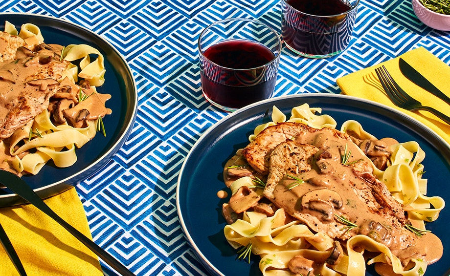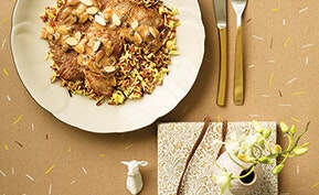 Escalopes de veau rapido, sauce cari, raisins secs et amandes