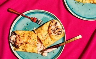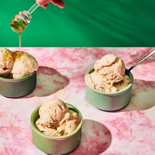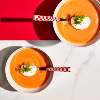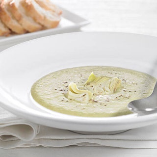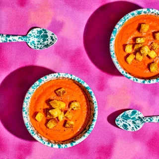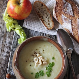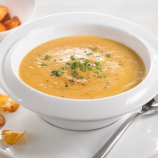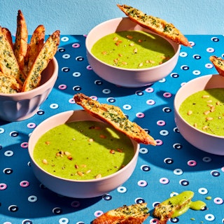 Crème de roquette, noix de pin grillées et croûtons à l’ail