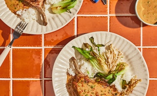 Côtelettes de porc, sauce au caramel, aux oignons verts et aux poivrons