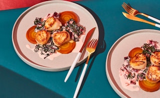 Pétoncles poêlés à la crème et au cidre, sur betteraves et bette à carde