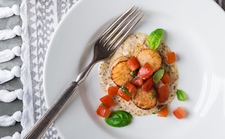 Pétoncles à la crème de poireau accompagnés d'un croustillant d'amandes et de fromage