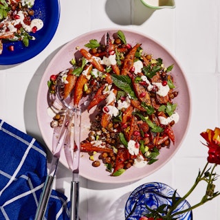 Salade de carottes et de pois chiches rôtis, avec vinaigrette au tahini