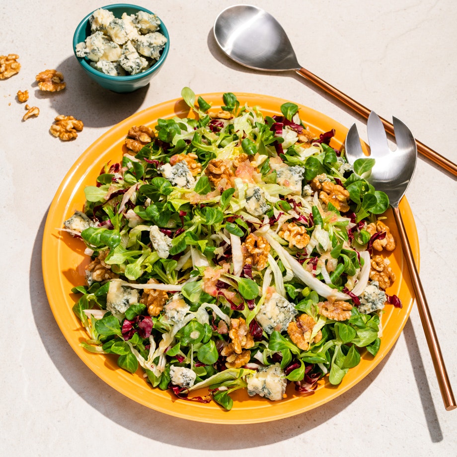 Salade de mâche et de laitues aux noix et au bleu, vinaigrette à la camomille