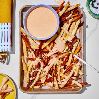 Frites de légumes au four, sauce au cheddar et au piment chili