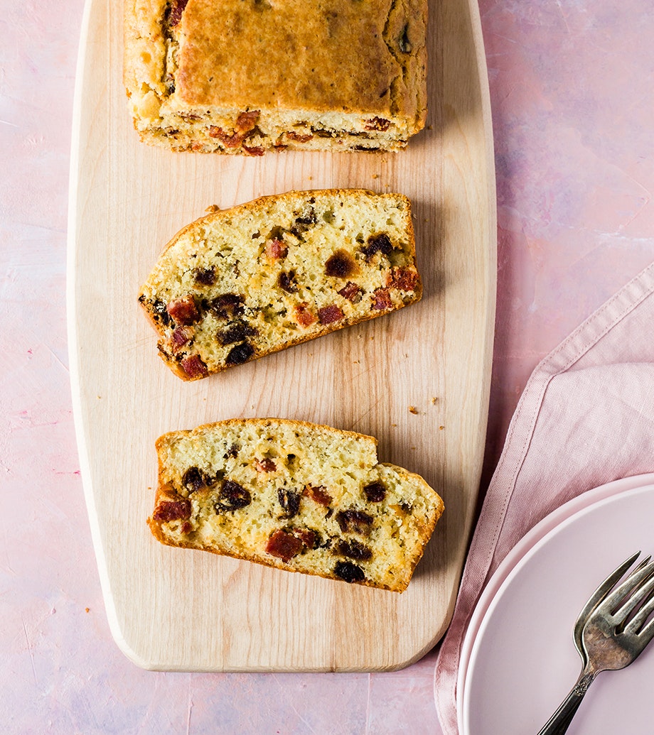● Les cakes salés sont meilleurs dégustés le jour même. Vous pouvez légèrement griller ou réchauffer les tranches le lendemain.↲ ● Vous pouvez utiliser du lait de beurre (babeurre) à la place du lait 2 %. Omettre le vinaigre dans ce cas.