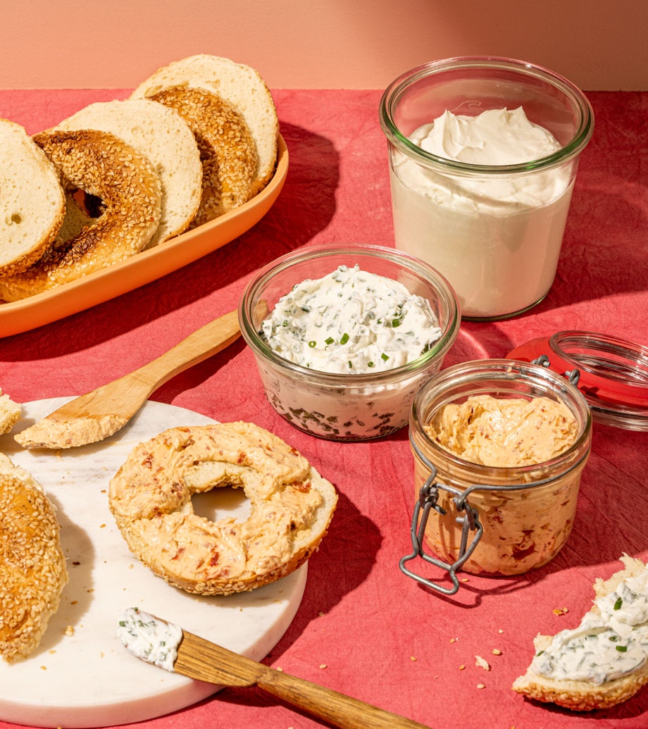 Ces fromages à la crème sont délicieux sur des bagels ou sur des craquelins. On peut remplacer la ciboulette et les tomates séchées par d’autres ingrédients pour aromatiser le fromage, si désiré : autres fines herbes hachées, poivrons rôtis hachés, pesto, etc. Si on prépare les trois recettes (le fromage à la crème nature et ses deux variantes), on obtient un total d’environ 27 portions de 30 ml (2 c. à soupe) chacune.