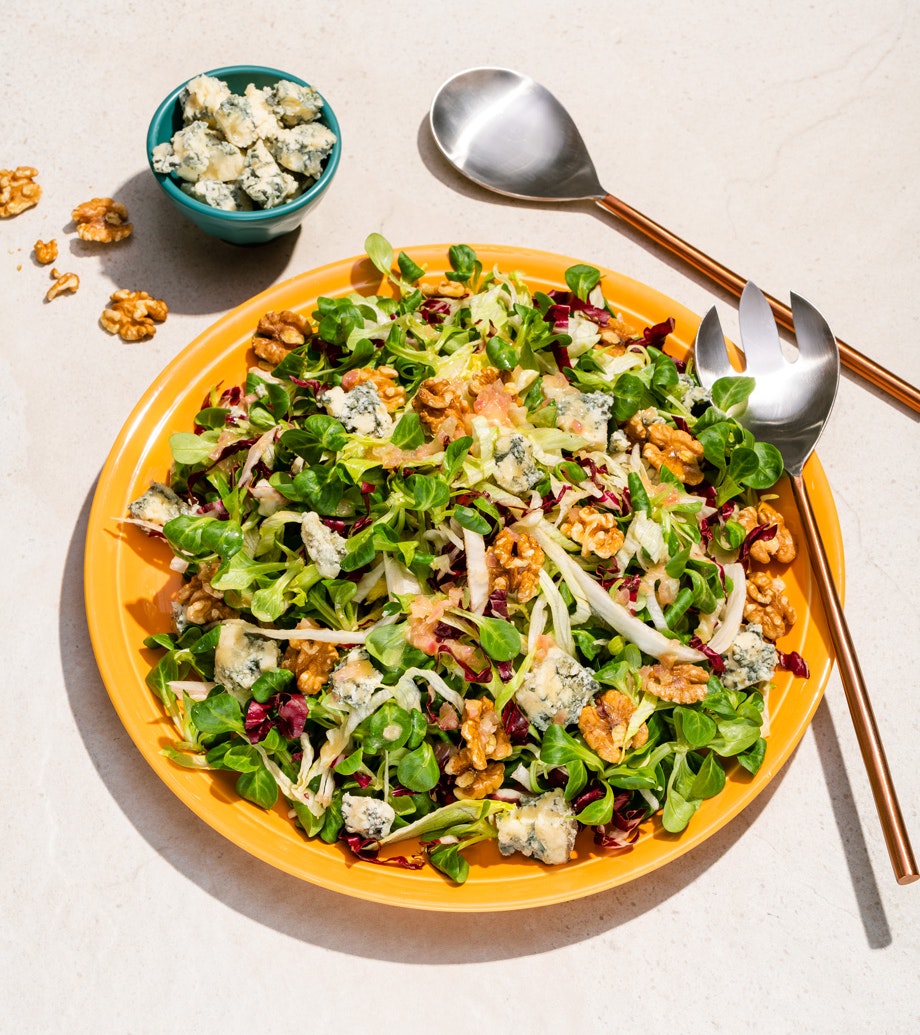 Salade de mâche et de laitues aux noix et au bleu, vinaigrette à la camomille