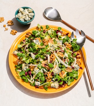 Salade de mâche et de laitues aux noix et au bleu, vinaigrette à la camomille