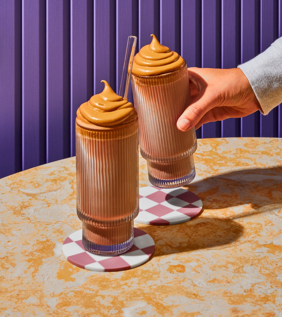 On peut servir le mélange fouetté de cette recette sur du lait au chocolat ou du lait nature, chaud ou froid, au choix.