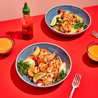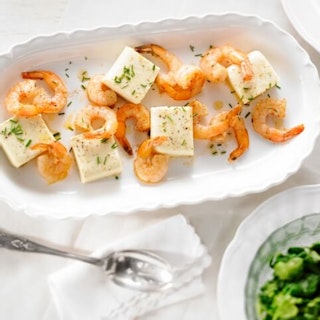 Sauté de crevettes, cubes de crème gélifiée à l’érable et au cari