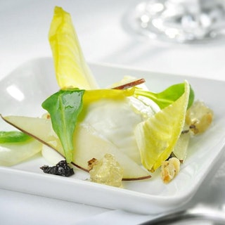 Le Champlain en espuma, endives et poires, confiture d’olives noires et gelée de bière artisanale