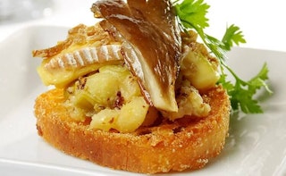 Le Rang des Îles en croûte de marrons sur baguette, garni de pommes confites et de pleurotes fumés