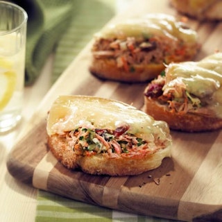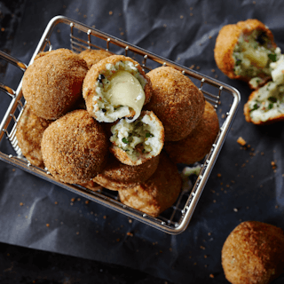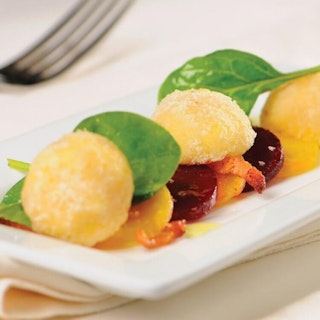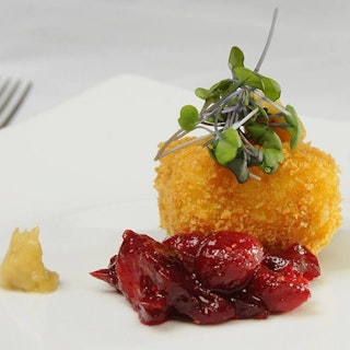Croquette à la pancetta et au fromage Le Tremblay, confiture de canneberges et purée d’ail rôti