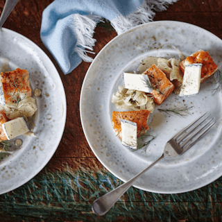 Croquettes de fromage, purée d'oignons caramélisés, bacon et pomme