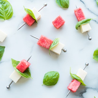 Brochettes de melon d'eau, fromage et huile au zaatar