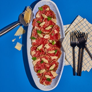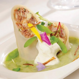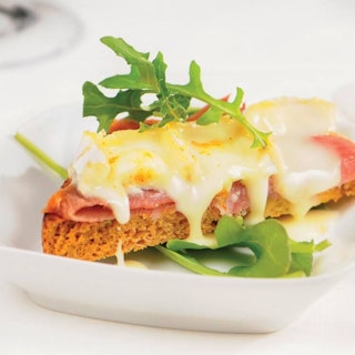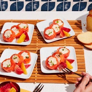 Roulés de gravlax de saumon, betteraves marinées et émulsion au fromage brie