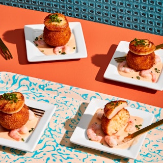 Arancinis au fromage, crème de crevettes au paprika fumé et pétoncles saisis