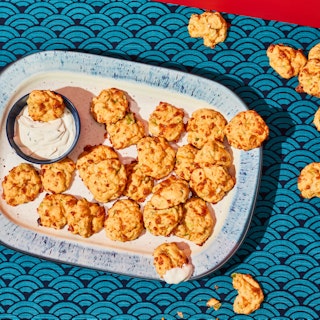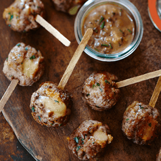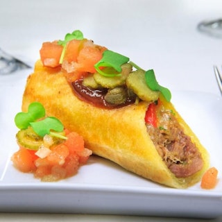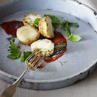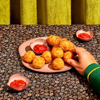 Arancinis au fromage Tête Dure et collier d’agneau effiloché, sauce aux poivrons rouges grillés