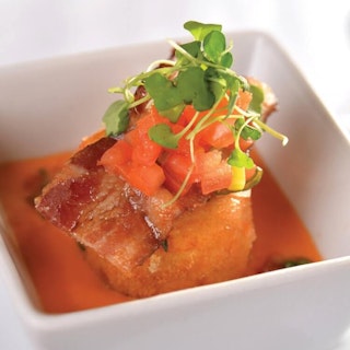 « BLTF », velouté crémeux de tomates aromatisé au fromage Le Cabouronsa de tomates épicées, pousses de roquette