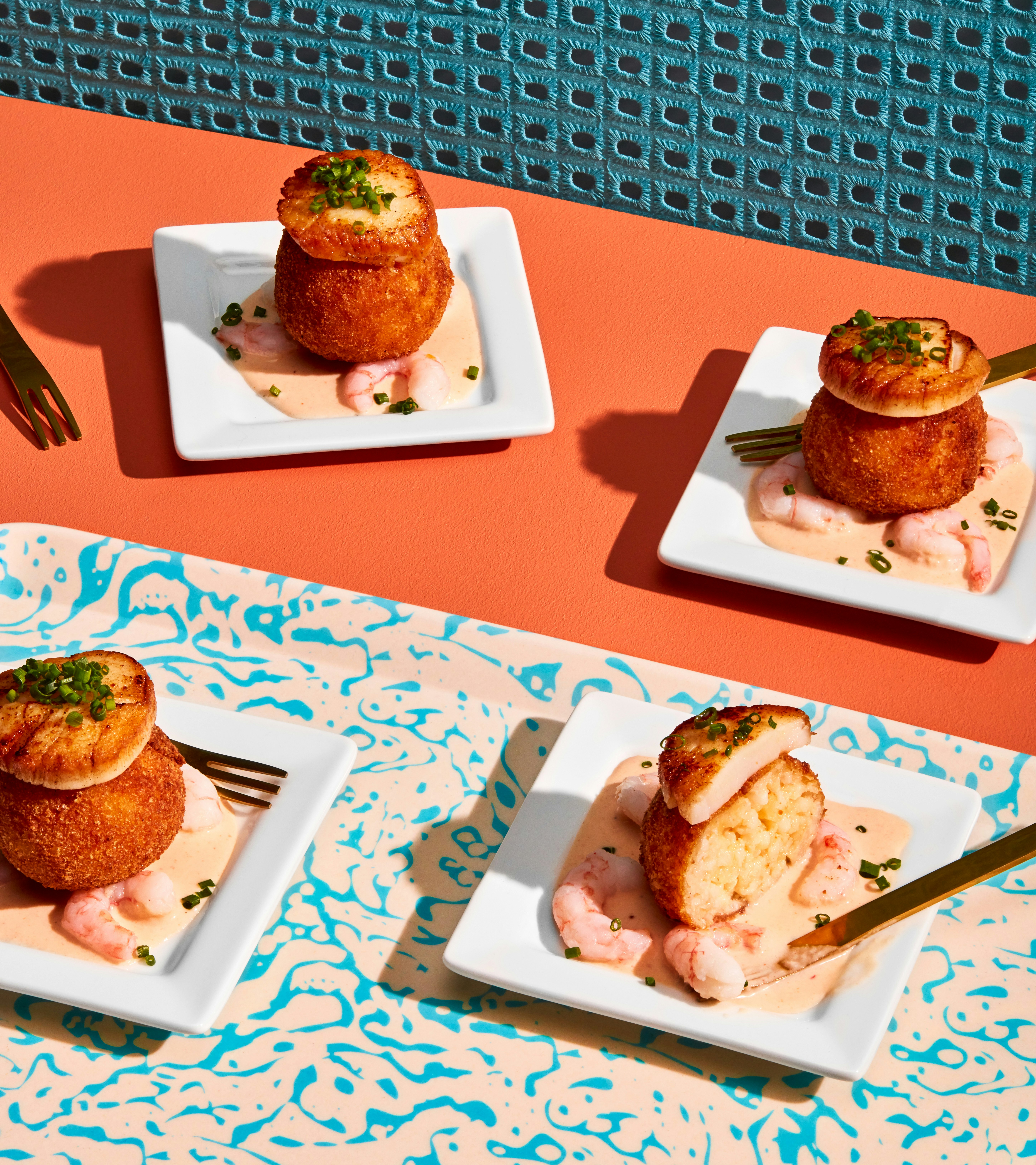 Arancinis au fromage, crème de crevettes au paprika fumé et pétoncles saisis