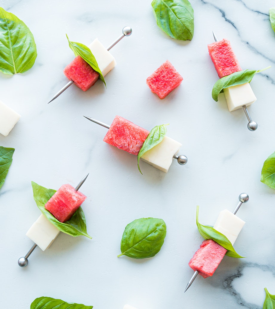Brochettes de melon d'eau, fromage et huile au zaatar