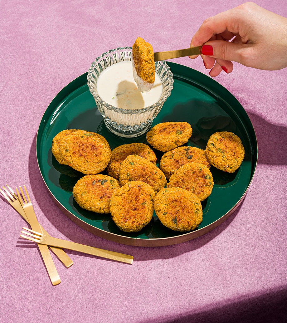 Croquettes de crabe, quinoa et patates douces, trempette à la crème sure et à l’orange