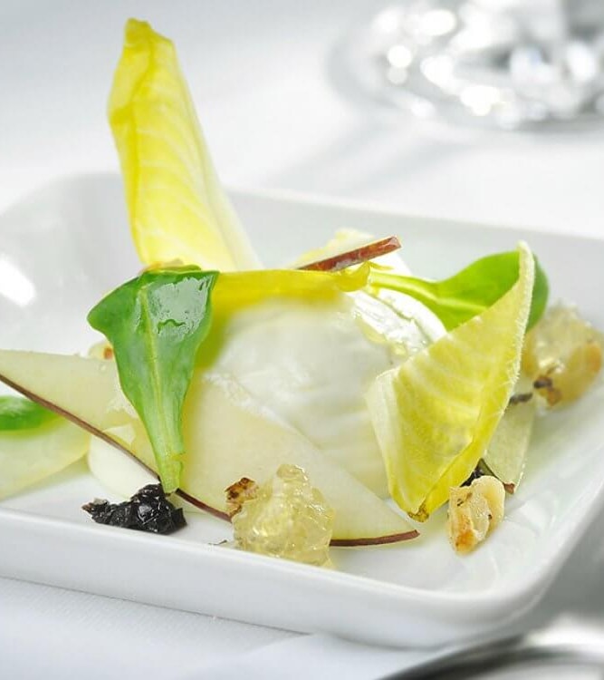 Le Champlain en espuma, endives et poires, confiture d’olives noires et gelée de bière artisanale