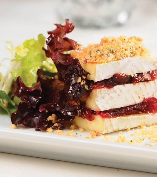 Marbré de Brie Vaudreuil et canneberges séchées, crumble au thym, salade à l’érable