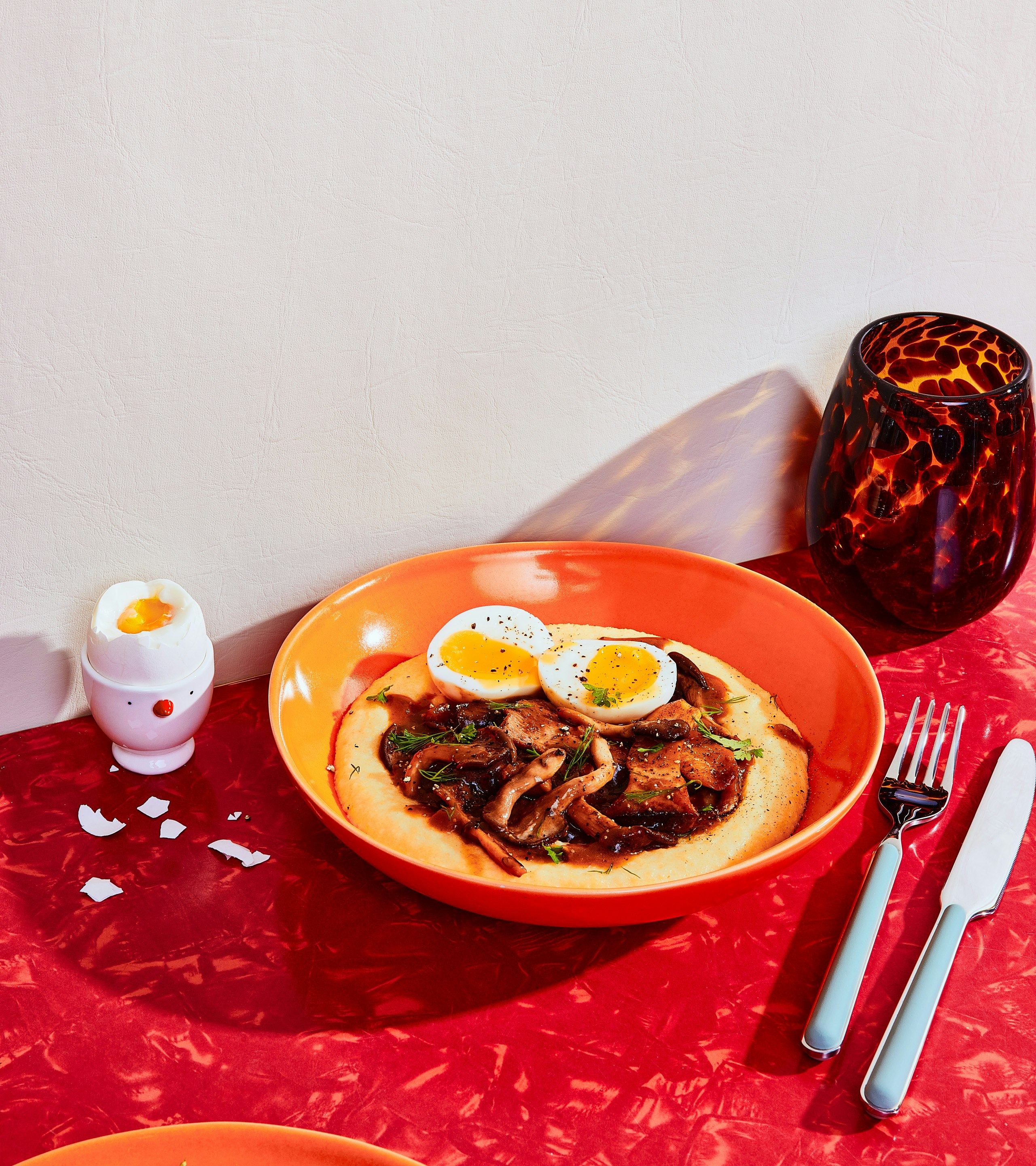 Polenta crémeuse, champignons en sauce à la bière, œufs mollets