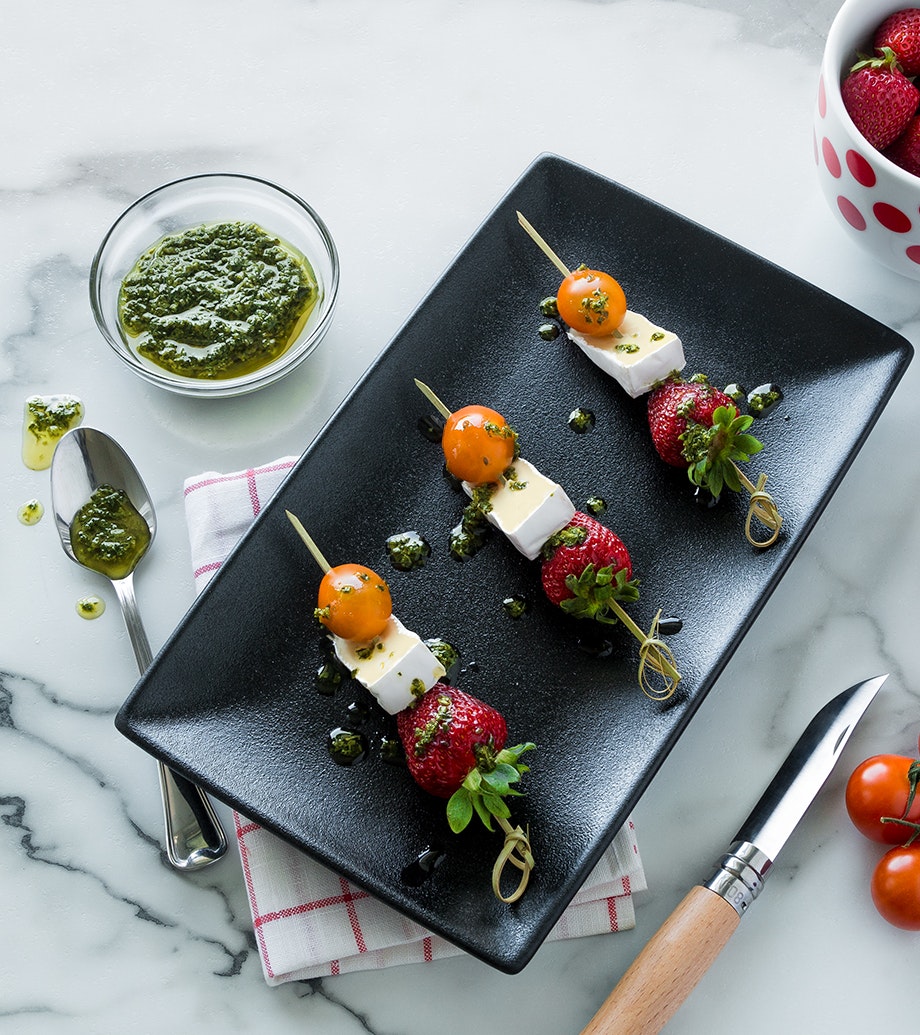 Remplacer le fromage par un autre fromage d’ici et remplacer le pesto par une réduction de vinaigre balsamique.