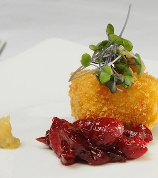 Croquette à la pancetta et au fromage Le Tremblay, confiture de canneberges et purée d’ail rôti