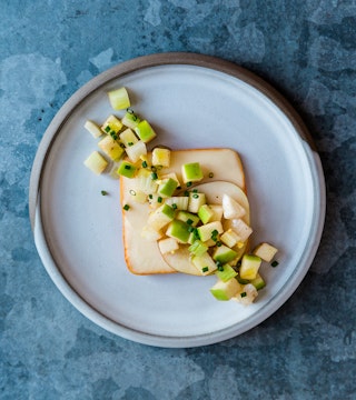 Entrée de fromage et poire, salsa de pomme et fenouil