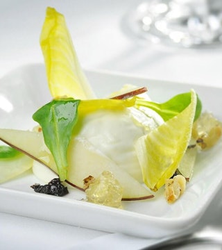 Le Champlain en espuma, endives et poires, confiture d’olives noires et gelée de bière artisanale