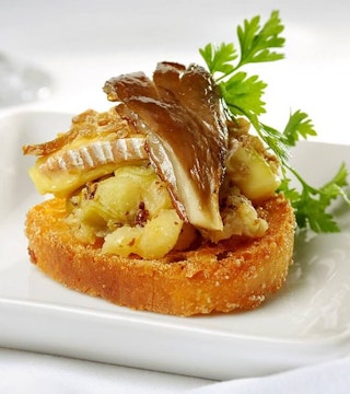 Le Rang des Îles en croûte de marrons sur baguette, garni de pommes confites et de pleurotes fumés