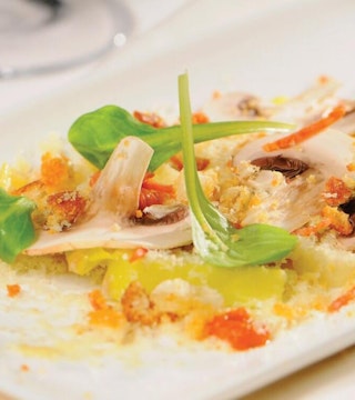 Neige de Laliberté, rubans de poireaux, purée de tomates confites et champignons de Paris