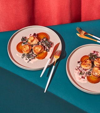 Pétoncles poêlés à la crème et au cidre, sur betteraves et bette à carde