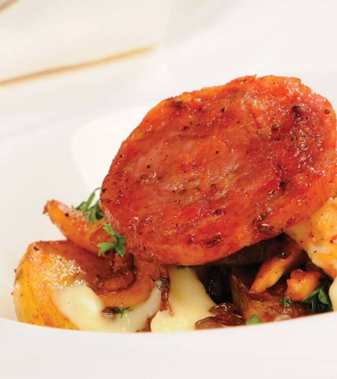 Pommes de terre rattes rôties, poêlée de champignons, saucisse de Morteau, sauce au fromage Le Pizy