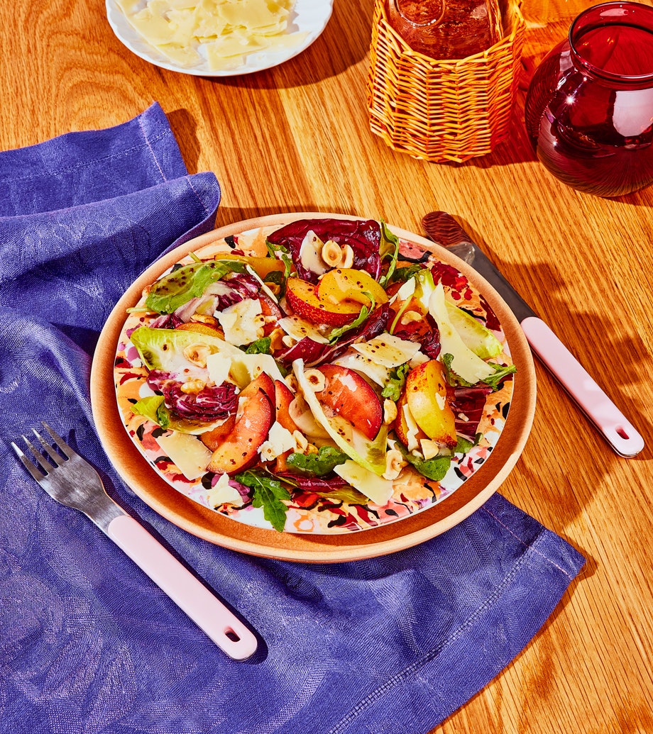 Si on n’aime pas l’amertume du radicchio, de la roquette et de l’endive, il est possible d’utiliser des laitues au goût plus doux.