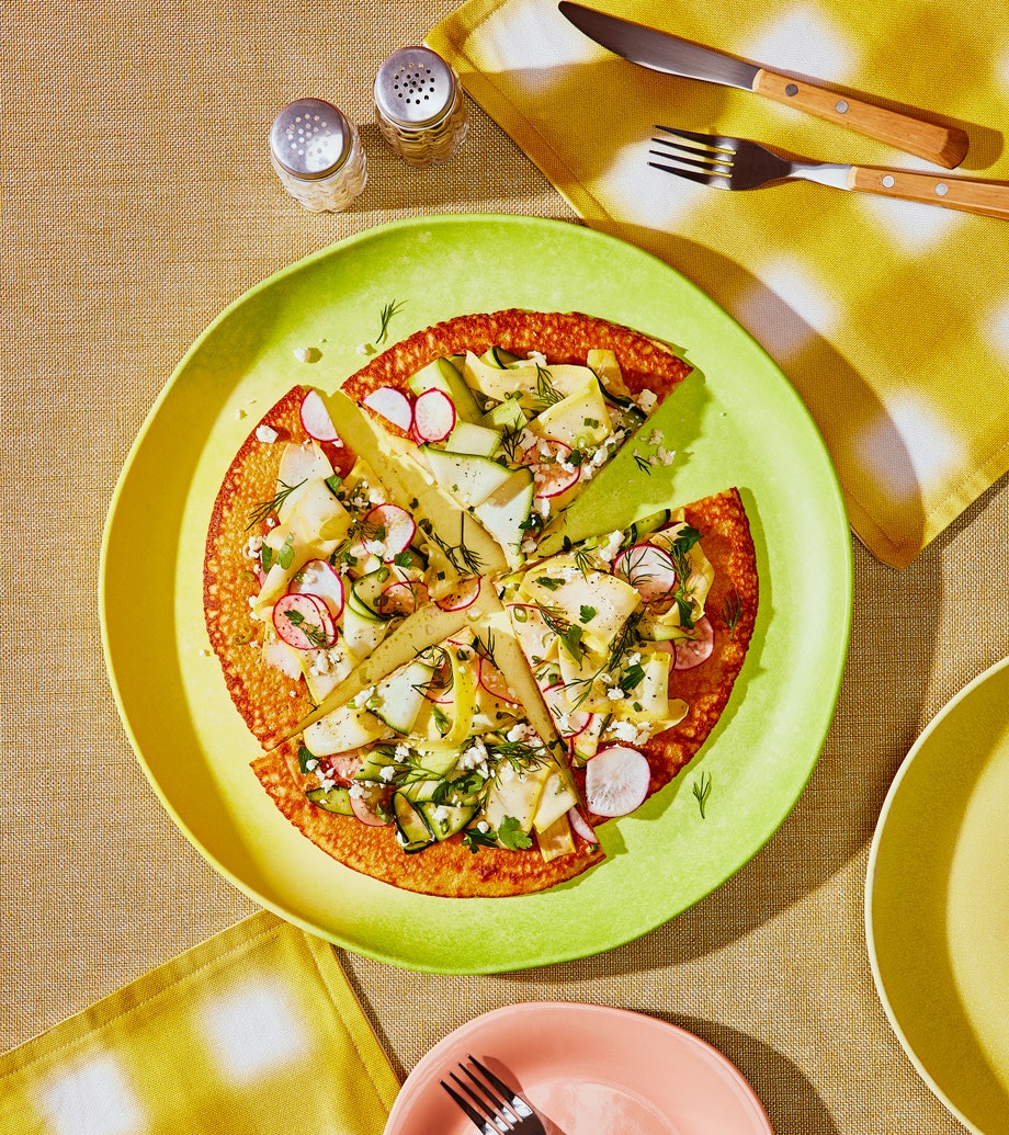 La recette de socca, sans la salade de zucchinis et la vinaigrette, peut aussi servir à faire une pizza sans gluten. Une fois la socca cuite, la recouvrir des garnitures de son choix et passer la poêle sous le gril pendant deux minutes ou jusqu’à ce que le fromage soit gratiné.