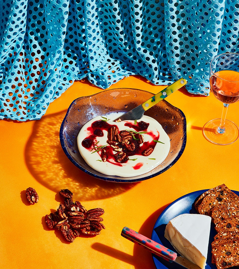 Accompagnements suggérés : craquelins ou tranches de baguette. Il est possible de remplacer les garnitures suggérées par la confiture, les noix et les herbes de son choix.